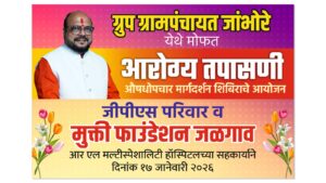 ⭕*ग्रामविकासार्थ सदैव कटिबद्ध असून, आरोग्य सेवा ईश्वरीय कार्य आहे** *पालकमंत्री ना.गुलाबरावजी पाटील*⭕ *जांभोरा येथे *जीपीएस परिवार व मुक्ती फाउंडेशन तर्फे आरोग्य मोफत आरोग्य शिबिर संपन्न*